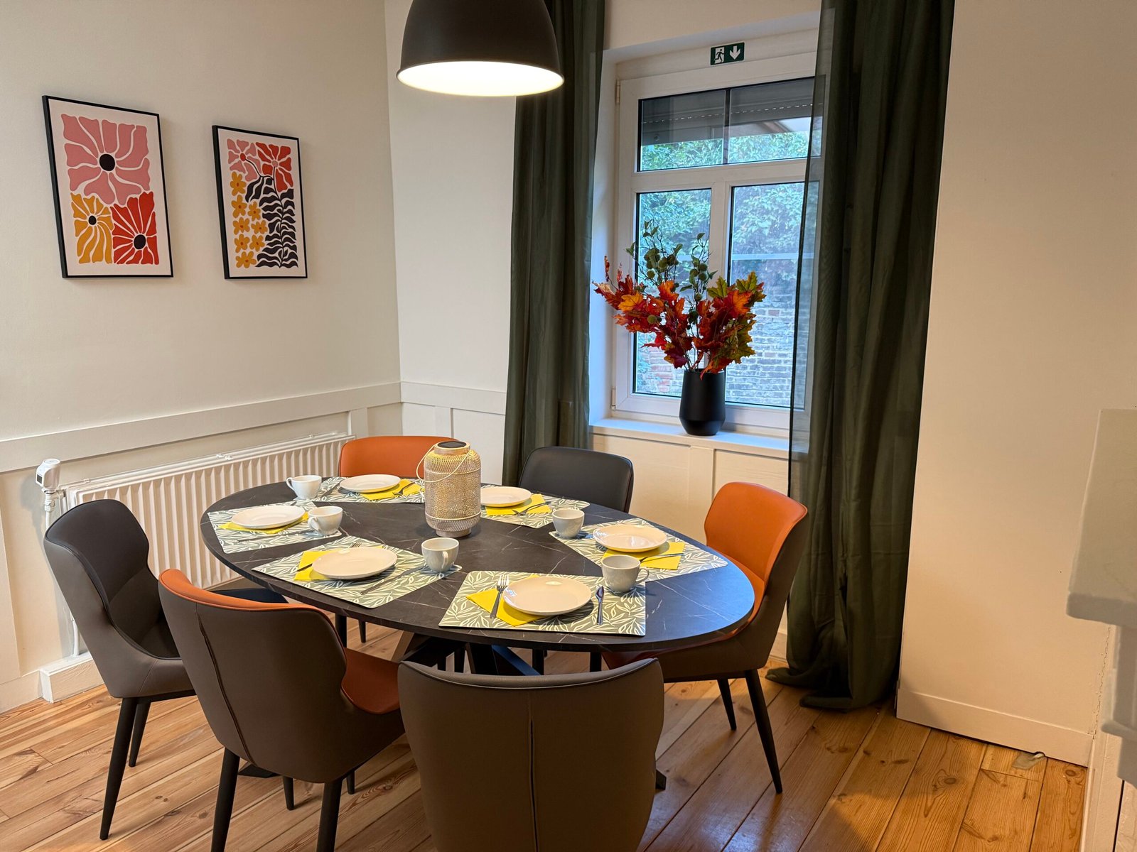 In de eetkamer staat een tafel met 6 stoelen en is er een kinderstoel beschikbaar.